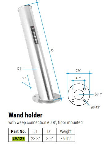 Porta varilla Mosmatic 29.127, montaje en suelo, cuerpo de acero inoxidable de 28,3", conexión de drenaje de 0,8", diámetro de 3,9"