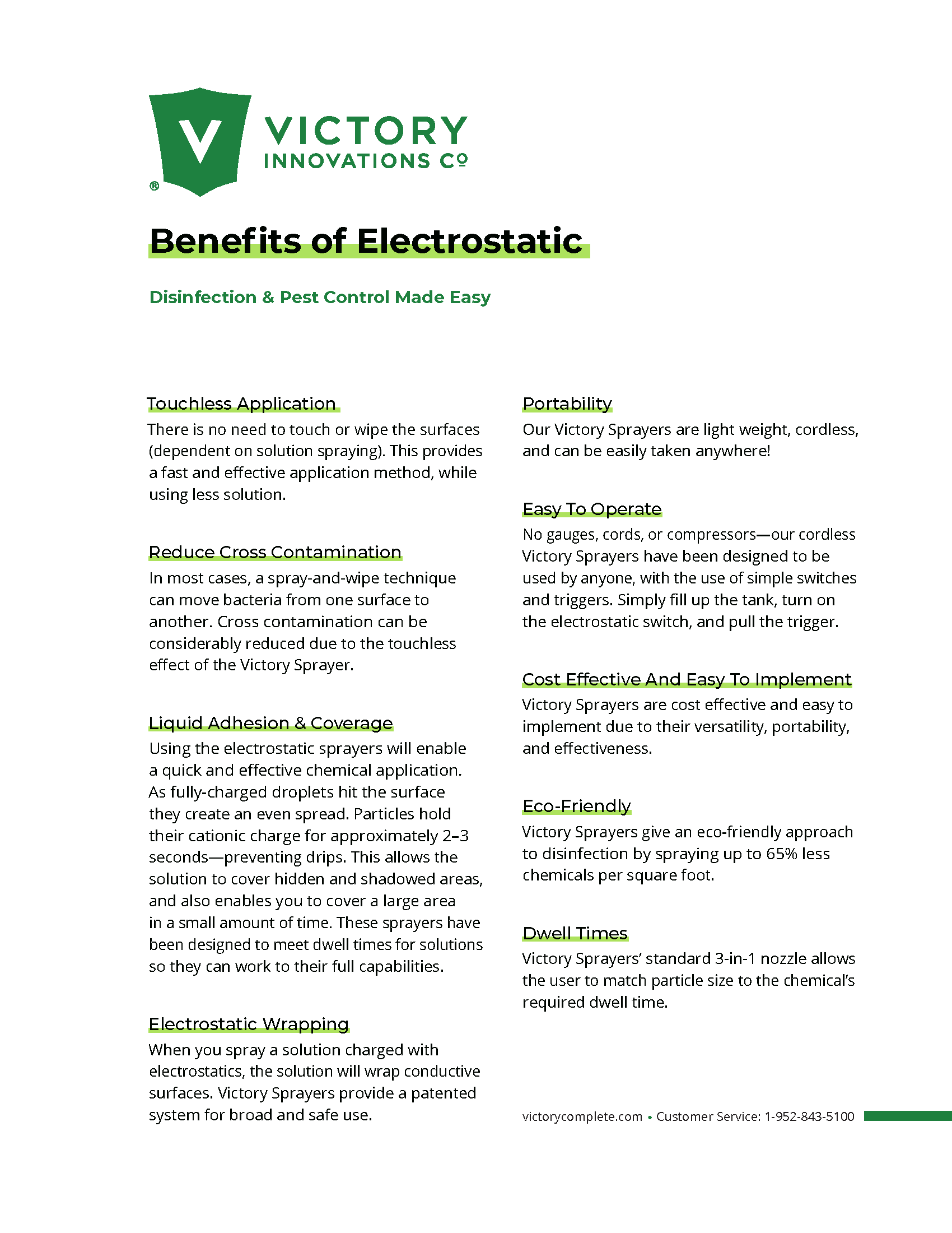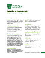 Folleto de Victory Innovations que describe los beneficios de la pulverización electrostática. Puede imprimirse como folleto o usarse en una página web.