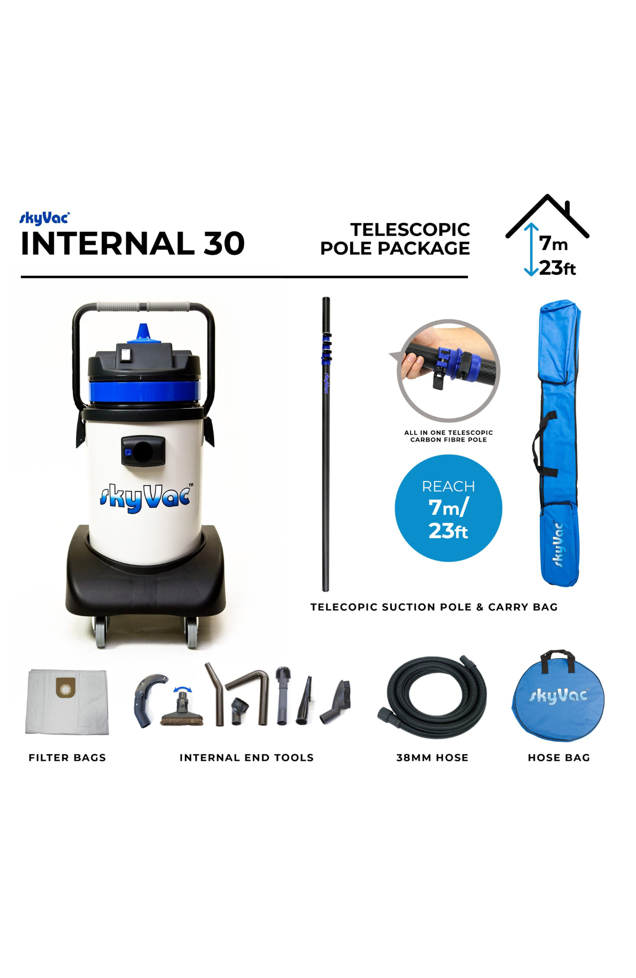 El modelo Internal 30 está diseñado para la limpieza en seco de interiores, eliminando polvo, telarañas y residuos ligeros. Para aplicaciones húmedas o de uso intensivo, otros modelos de SkyVac pueden ser más adecuados.