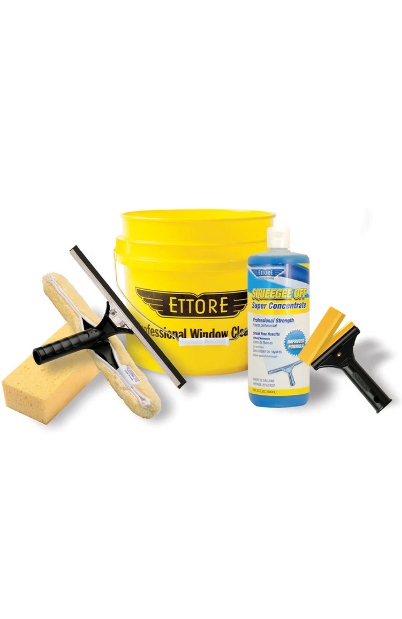 Una botella de 32 onzas de solución de limpieza de ventanas profesional Squeegee-Off® y una esponja de celulosa también forman parte del kit, proporcionando todo lo necesario para abordar la suciedad, la grasa y las rayas con facilidad.