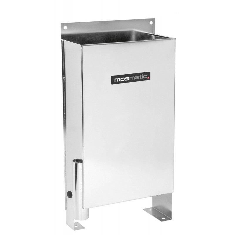 Mosmatic Brush Bucket 29.027 made of polished stainless steel with overflow, wall and floor mount design, featuring a 2-inch drain and integrated debris collector.